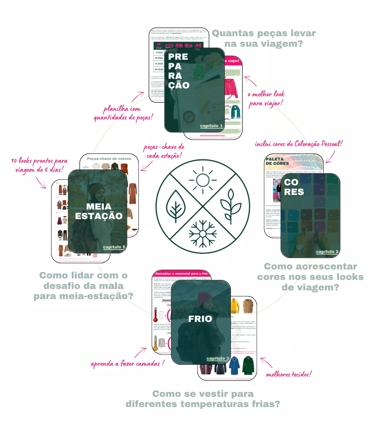 ✓ Listas de peças-chave para cada estação, ajudando você a montar uma mala mais assertiva.